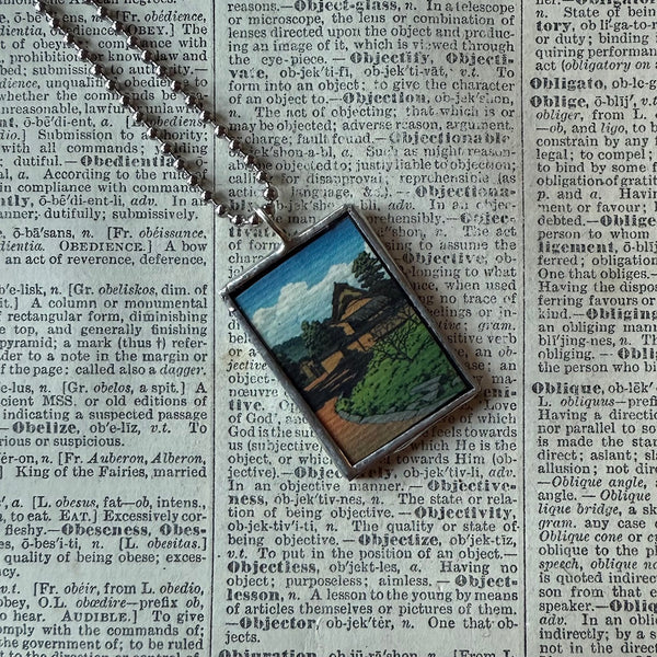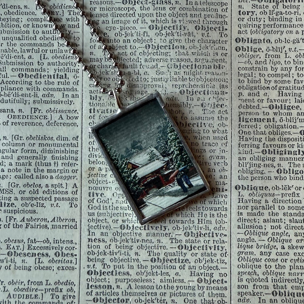 Pagoda in snow, tea house, Japanese woodblock prints, up-cycled to hand-soldered glass pendant