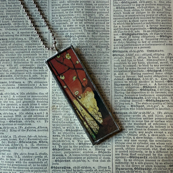 Hand soldered glass pendant made with snippets of Japanese woodblock prints on both sides. The images were upcycled from postcards featuring Japanese woodblock prints.
