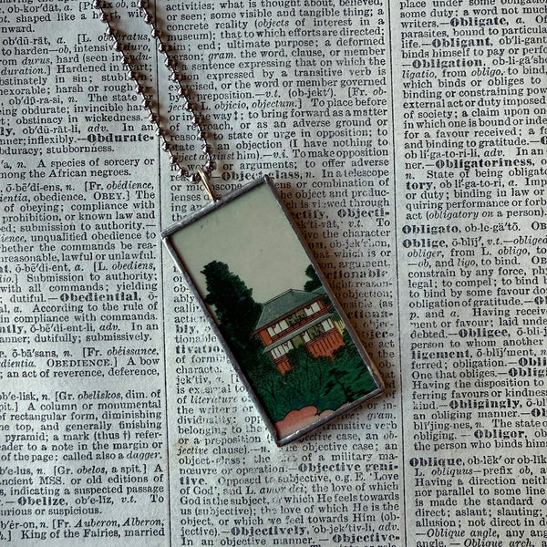 Cherry blossoms, pagoda, Japanese woodblock prints, up-cycled to hand-soldered glass pendant