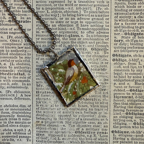 Handcrafted pendant with snippets of a charming goldfinch bird on one side and flowers on the opposite. The images were upcycled from a vintage greeting card.