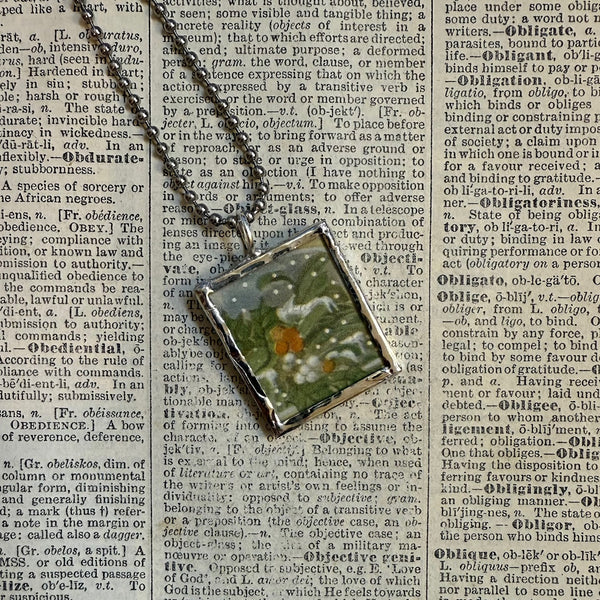 All of our pendants are created from the original source material, curated and up-cycled directly from vintage children's books, dictionaries, old calendars, and other printed materials diverted from the waste stream. We NEVER duplicate, copy or reproduce images. This means your pendant is a unique, one-of-kind item, and we enjoy good "copyright karma" by respecting the intellectual property of the original artists!