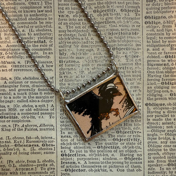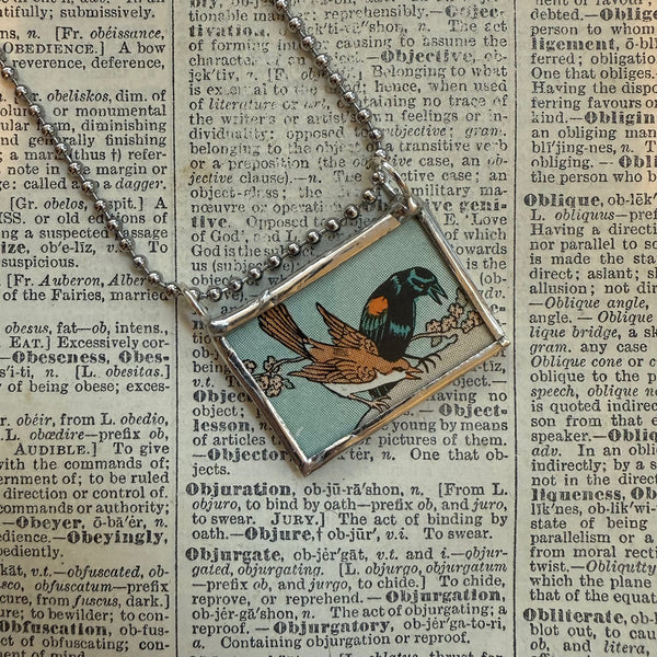 Handcrafted pendant with snippets of a Black crow, sparrow, and redwing blackbird on either side. The images were upcycled from a vintage 1930s children's book.