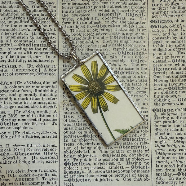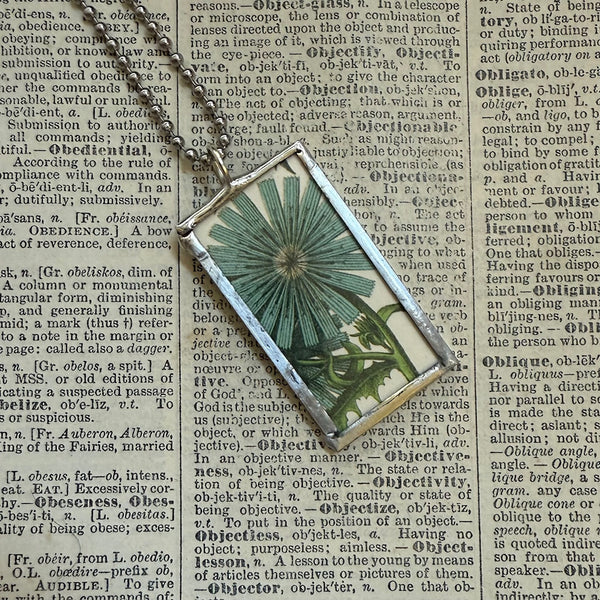 Handcrafted 2-sided pendant with illustrations of thistle on both sides. The images were upcycled from calendar of vintage botanical illustrations.