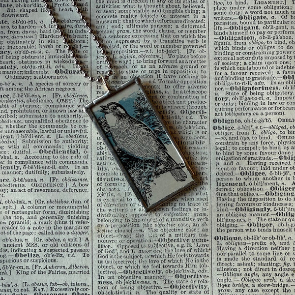 Handcrafted pendant with snippets of a charming bird on one side and flowers on the opposite. The images were upcycled from a vintage 1930s children's book.