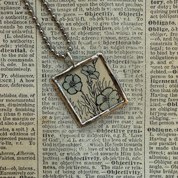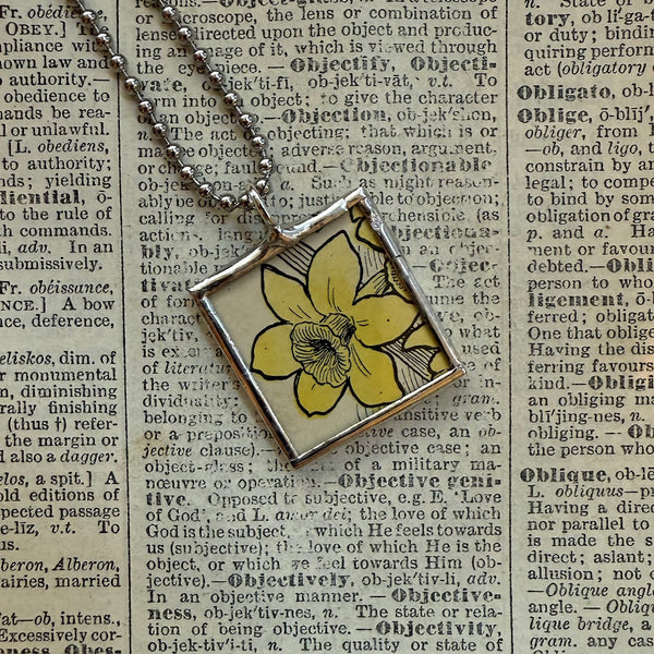 Handcrafted 2-sided pendant with illustrations of forget me not flowers and daffodils on either side. The images were upcycled from a vintage 1930s children's book.