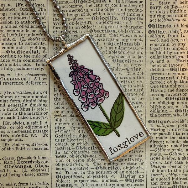 Handcrafted 2-sided pendant with illustrations of Foxglove and Violet flowers on either side. The images were upcycled from salvaged vintage Richard Scarry children's book.