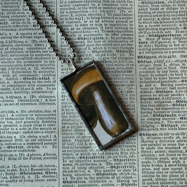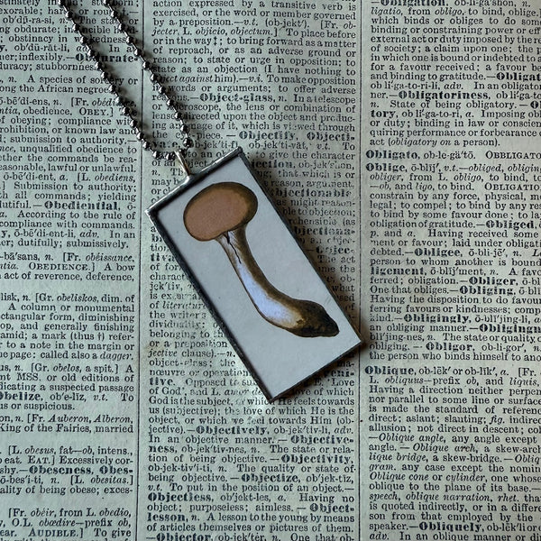 Handcrafted pendant featuring illustrations of mushrooms on both sides. The images were snipped from a calendar of antique botanical illustrations.