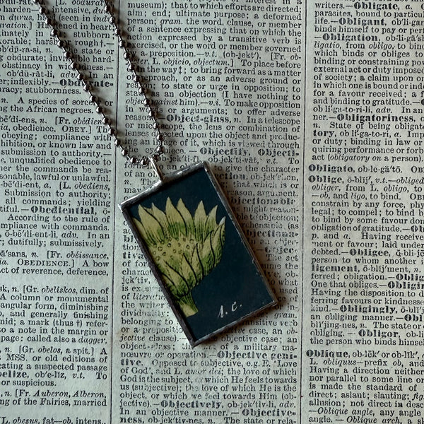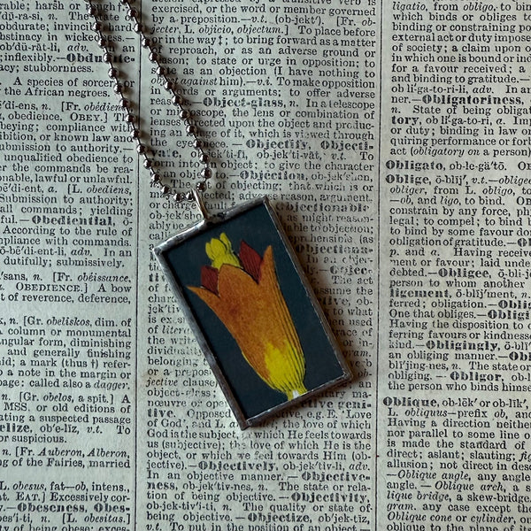 Handcrafted pendant featuring illustrations of a crocus blossom on one side and a flower's sepal on the opposite. The images were snipped from a calendar of antique botanical illustrations.