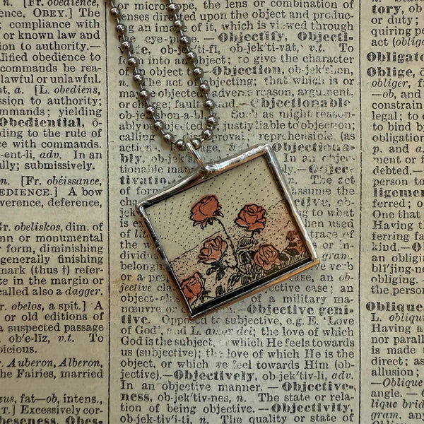Handcrafted 2-sided pendant with illustrations of Red roses and sunrise on either side. The images were upcycled from a salvaged vintage 1930s children's book.