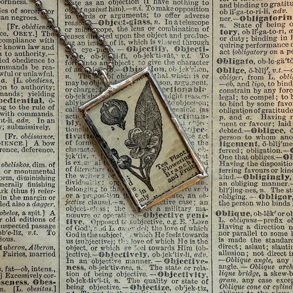 Handcrafted pendant with scientific/botanical illustration of a tea plant, snipped from a vintage dictionary. The reverse side features a snippet of the dictionary definition of the word "tea"