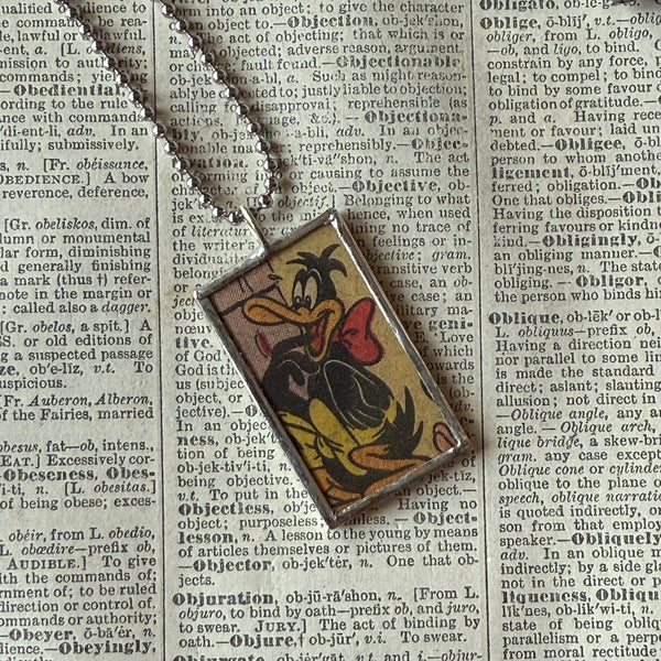 Handcrafted, 2-sided soldered glass pendant with Bugs Bunny and Daffy Duck a on either side, snipped from a vintage 1970s comic book.