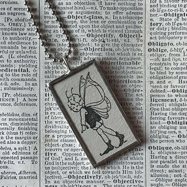 Handcrafted 2-sided pendant with illustrations from a salvaged vintage children's book featuring a little fairies.