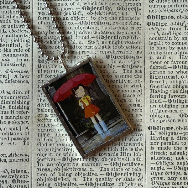 Handcrafted 2-sided pendant with stills from the Miyazaki classic, My Neighbor Totoro, on both sides. The images were upcycled from a book of Studio Ghibli art.