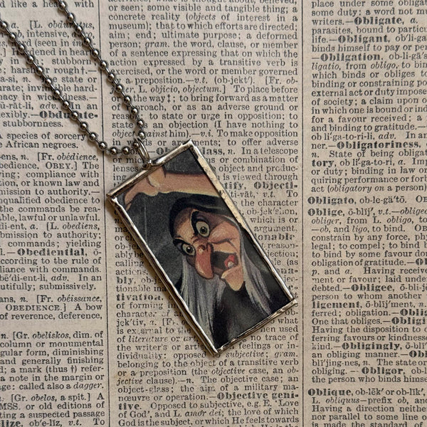 Handcrafted 2-sided pendant with illustrations from Snow White on one side and the evil queen sea hag on the opposite hat were snipped from a vintage Golden Book.
