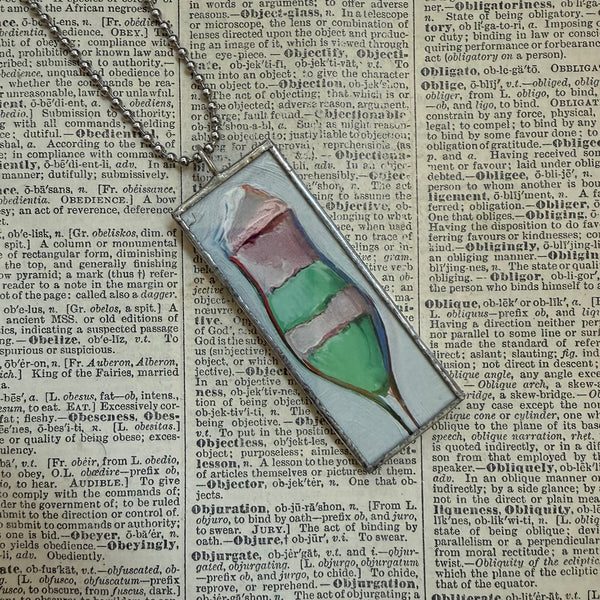 Handcrafted double-sided pendant featuring snippets of images from Wayne Thiebaud paintings on either sides. The images were upcycled from an expired calendar of the artist's work