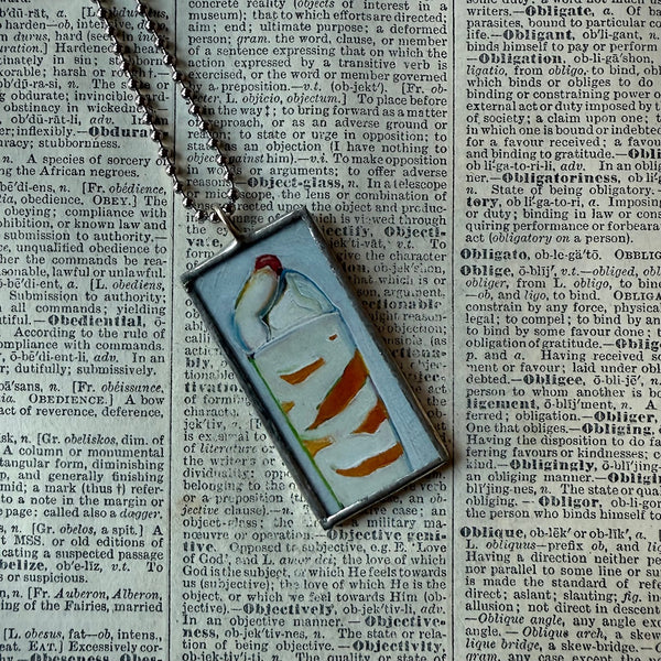All of our pendants are created from the original source material, curated and up-cycled directly from vintage children's books, dictionaries, old calendars, and other printed materials diverted from the waste stream. We NEVER duplicate, copy or reproduce images. This means your pendant is a unique, one-of-kind item, and we enjoy good "copyright karma" by respecting the intellectual property of the original artists!