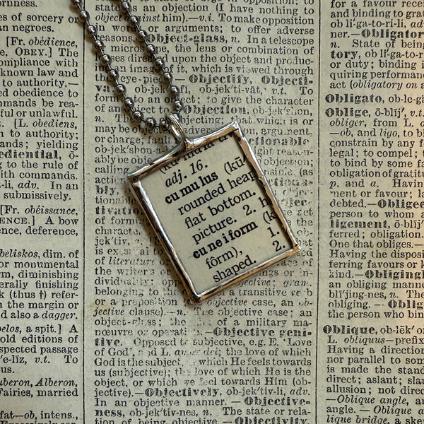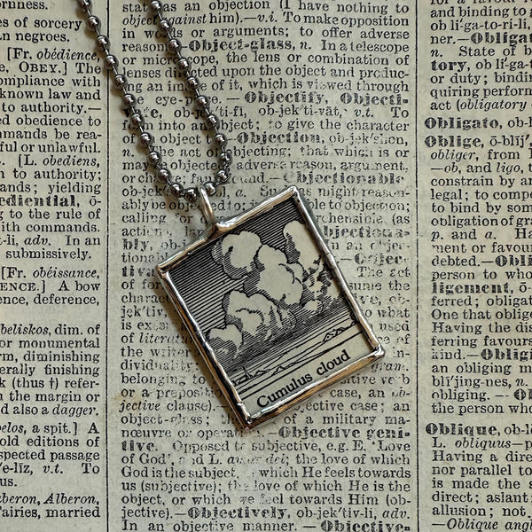 Handcrafted pendant with an illustration of cumulus clouds upcycled from a vintage 1930s dictionary. The opposite side features a snippet of the definition of the word "cumulus" from the same page.