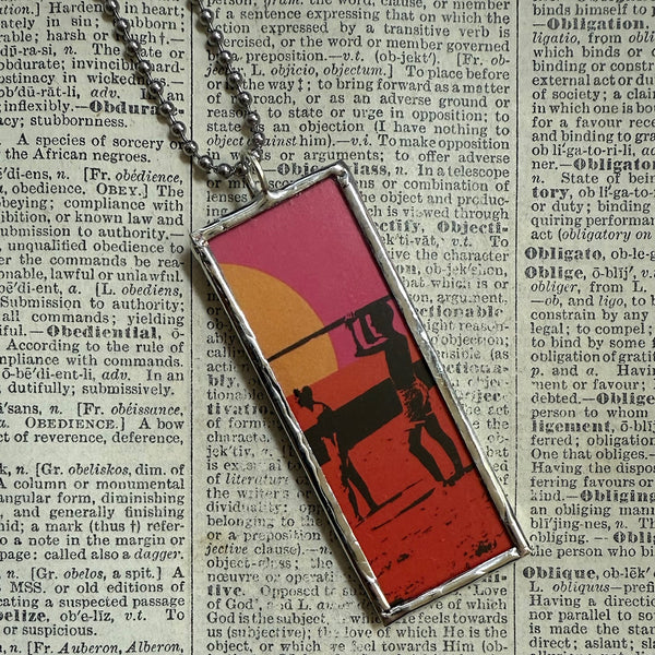 Handcrafted 2-sided, soldered glass pendant with images of a vintage movie poster from the Endless Summer on either side. The images were upcycled from a book of vintage album covers.