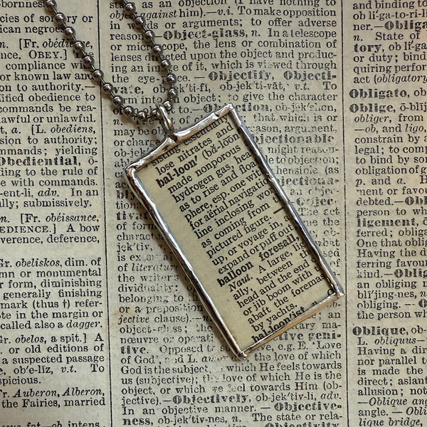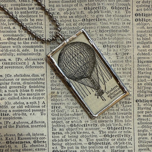 Handcrafted pendant with charming, original black and white illustrations of a hot air balloon on one side and a definition of the word "balloon" on the opposite. The images were snipped from a vintage 1930s dictionary.