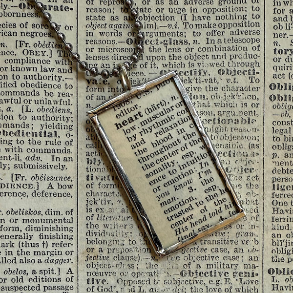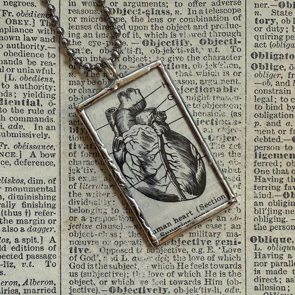 Handcrafted pendant with charming, original black and white illustrations of human heart on one side and a definition of the word "heart" on the opposite. The images were snipped from a vintage 1930s dictionary.