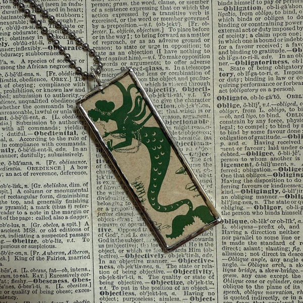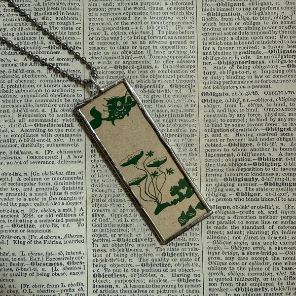 All of our pendants are created from the original source material, curated and up-cycled directly from vintage children's books, dictionaries, old calendars, and other printed materials diverted from the waste stream. We NEVER duplicate, copy or reproduce images. This means your pendant is a unique, one-of-kind item, and we enjoy good "copyright karma" by respecting the intellectual property of the original artists!