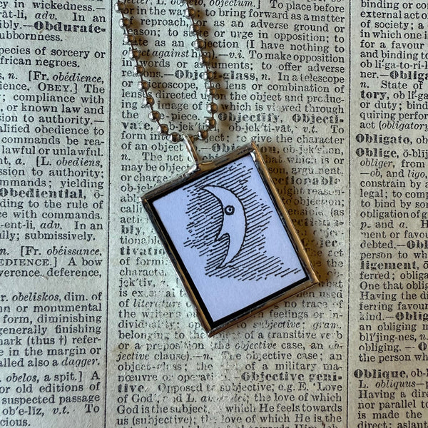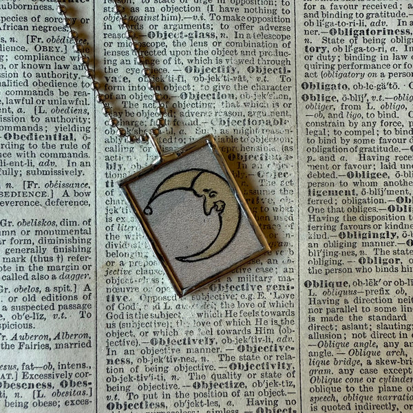 Handcrafted 2-sided soldered glass pendant featuring illustrations of the moon on opposite sides. The images were upcycled from vintage children's books.