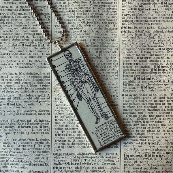 Handcrafted pendant with charming, original black and white illustrations of skeleton on one side and a definition of the word "skeleton" on the opposite. The images were snipped from a vintage 1930s dictionary.