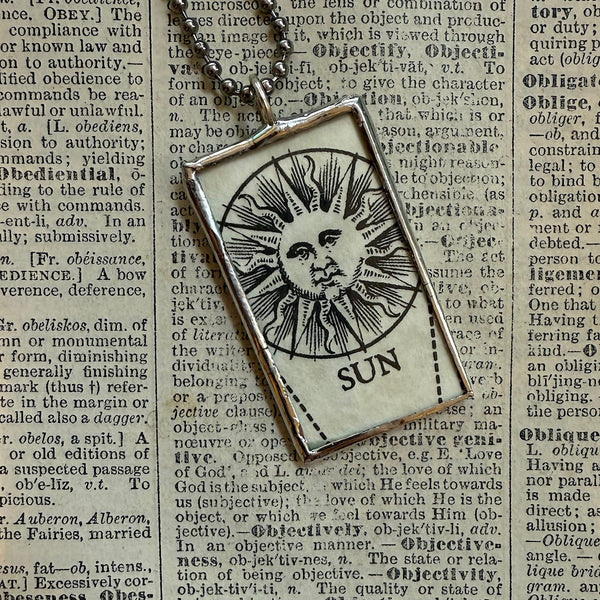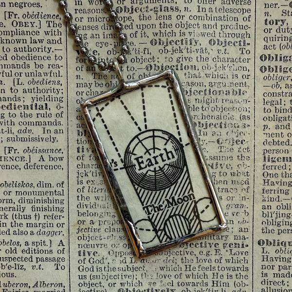 Handcrafted 2-sided pendant featuring an illustration of a sun on one side and an eclipse on the opposite. The images were upcycled from a book of victorian woodcut illustrations.
