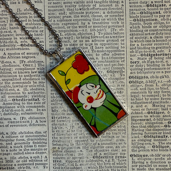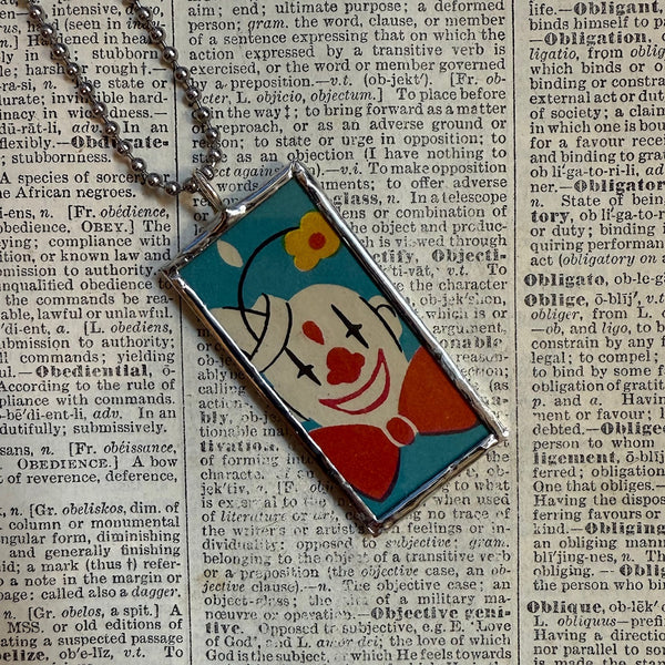 Handcrafted 2-sided pendant featuring illustrations of clowns on both sides that were snipped from a vintage 1930s children's book.