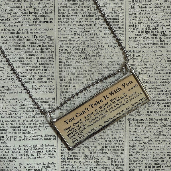 You Can't Take It WIth You, vintage dictionary pages, up-cycled to soldered glass pendant