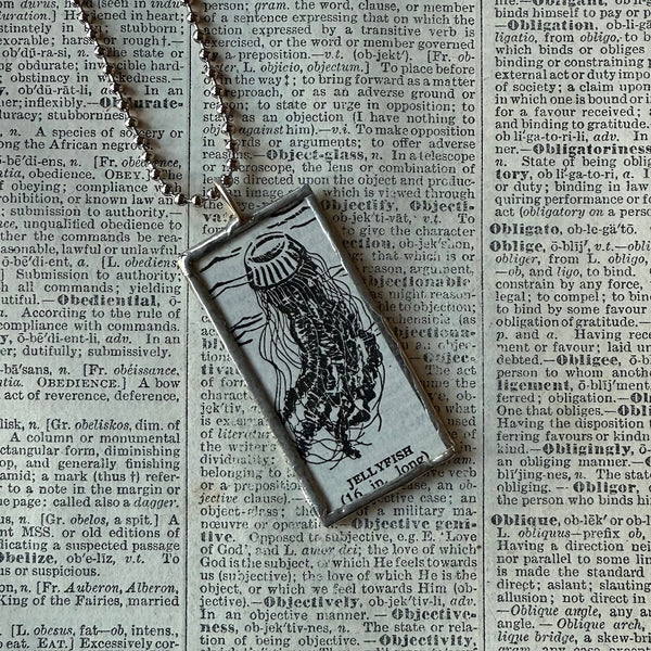 Handcrafted 2-sided pendant with illustrations of a jellyfish on one side that was upcycled from a vintage dictionary. On the opposite is a snippet of the definition of the word jellyfish that was snipped from the same page.