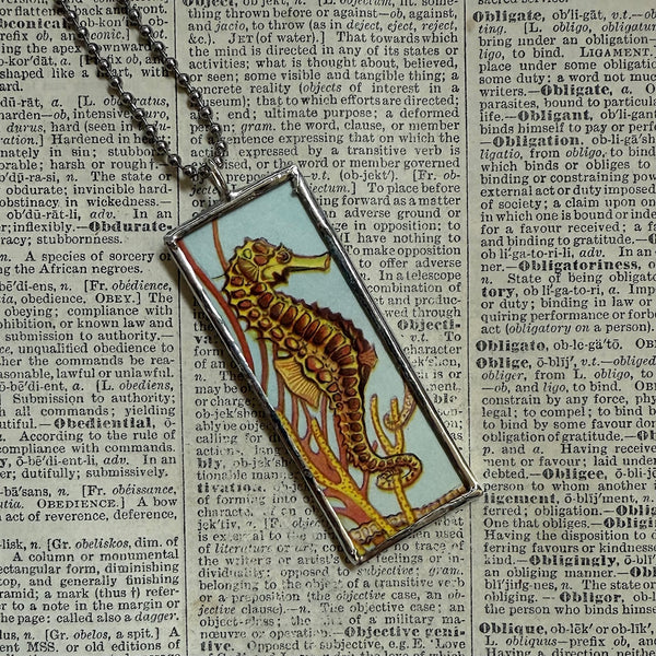 Handcrafted pendant with charming, original illustrations of a jellyfish and a sea horse on opposite sides. The images were snipped from a vintage children's book.