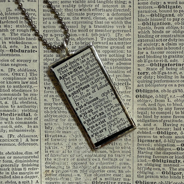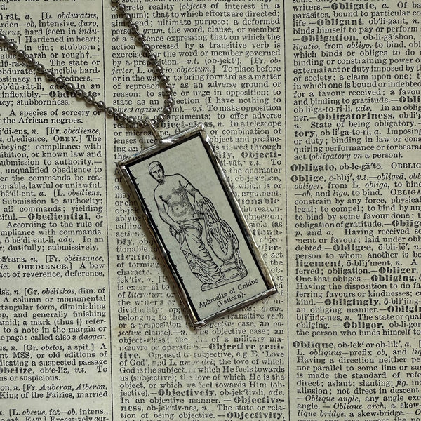 Handcrafted pendant with charming, original black and white illustration of Aphrodite, goddess of love. The image was snipped from a vintage dictionary and on the reverse side is a snippet of the definition of the word "Niobe"