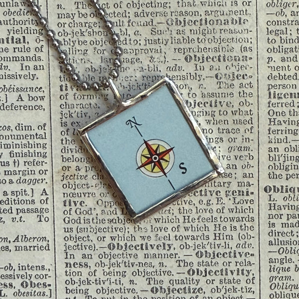 Handcrafted pendant with snippets of a vintage map with Buenos Aires on one side and a compass rose on the opposite. The images were upcycled from a vintage atlas.