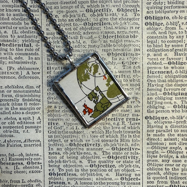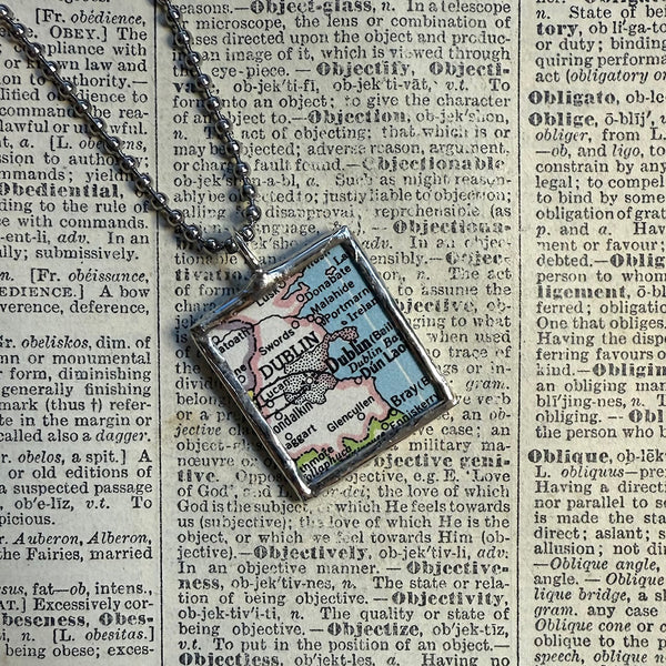 Handcrafted pendant with snippets of a vintage map with Dublin and Ireland on either sides. The images were upcycled from a vintage atlas.