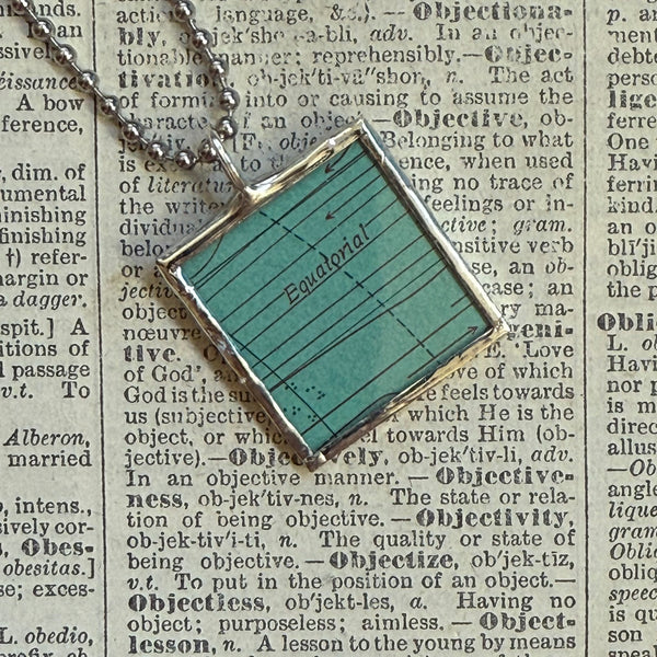 Handcrafted pendant with snippets of a vintage map of Havana Cuba on one side and ocean currents on the opposite that were upcycled from a vintage atlas.