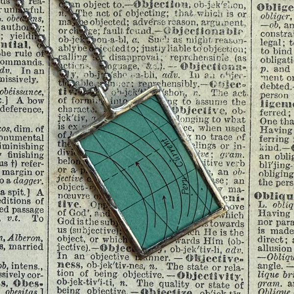 Handcrafted pendant with snippets of a vintage map with Italy on one side and ocean currents on the opposite. The images were upcycled from a vintage atlas.