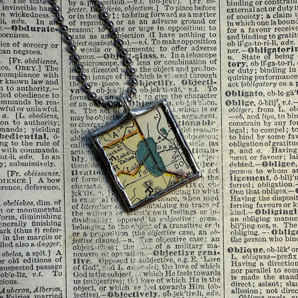 Handcrafted 2-sided pendant featuring snippets of a vintage map of Lake Tahoe and its waves on either side that were upcycled from a vintage atlas.