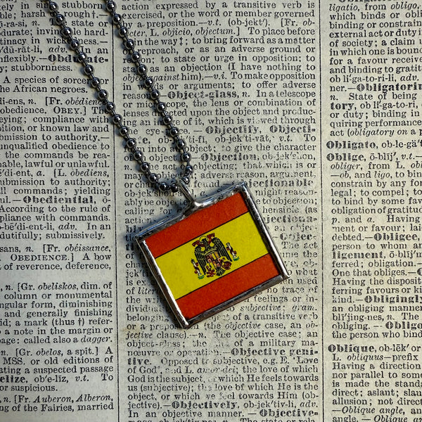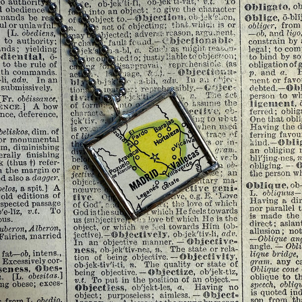 Handcrafted 2-sided pendant featuring snippets of a vintage map and flag of Madrid, Spain on either side that were upcycled from a vintage atlas.