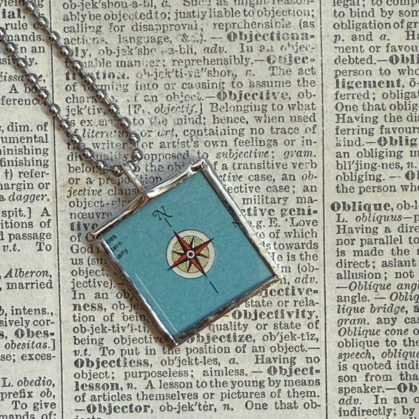 Handcrafted pendant with snippets of a vintage map with Stockholm Sweden on one side and a compass rose on the opposite. The images were upcycled from a vintage atlas.