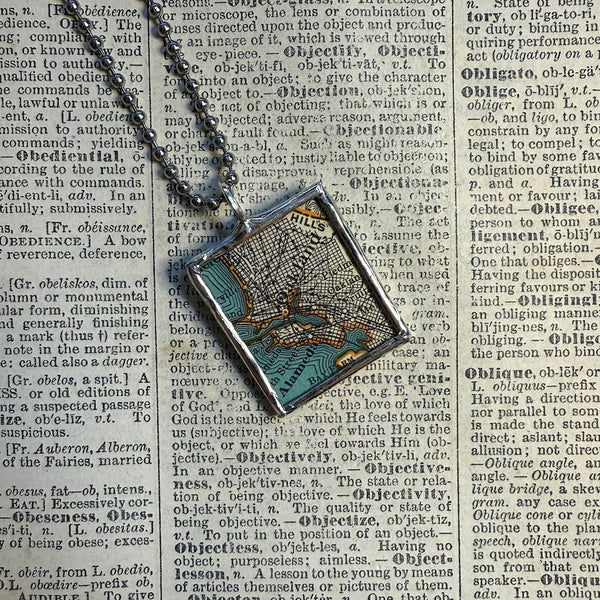 Handcrafted 2-sided pendant featuring snippets of a vintage map of Oakland, California that was upcycled from a vintage atlas.