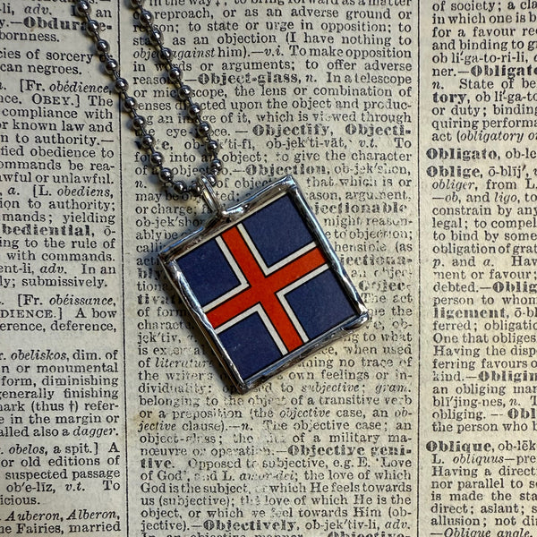Handcrafted 2-sided pendant featuring snippets of a vintage map and flag of Reykjavik, Iceland on either side that were upcycled from a vintage atlas.