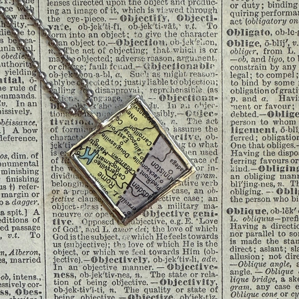 Handcrafted pendant with snippets of a vintage map of New York that were upcycled from a vintage atlas.
