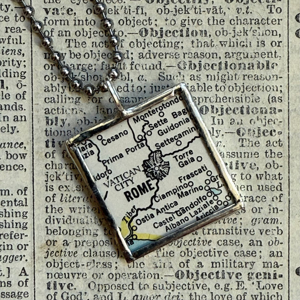 Handcrafted pendant with snippets of a vintage map of Rome on one side and Vatican City on the opposite that were upcycled from a vintage atlas.