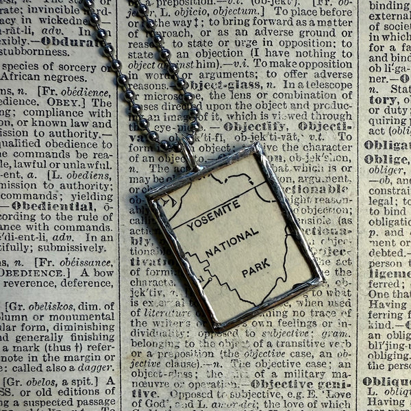 Handcrafted pendant with snippets of a vintage map with Yosemite National Park on both sides. The images were upcycled from a vintage atlas.