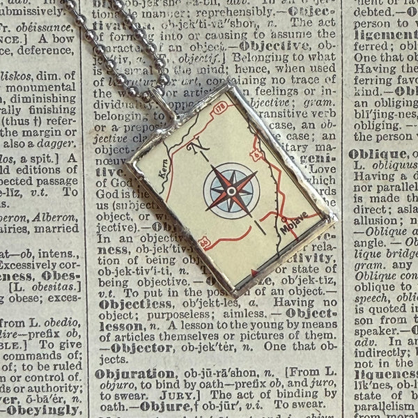 Handcrafted 2-sided pendant featuring snippets of a vintage map of Yosemite National Park on one side and a compass rose on the opposite that were upcycled from a vintage atlas.