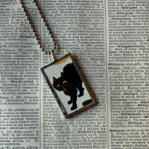Handcrafted 2-sided pendant with illustrations of black cats on both sides. The images were upcycled from a notecard with vintage halloween illustrations.