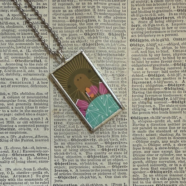 All of our pendants are created from the original source material, curated and up-cycled directly from vintage children's books, dictionaries, old calendars, and other printed materials diverted from the waste stream. We NEVER duplicate, copy or reproduce images. This means your pendant is a unique, one-of-kind item, and we enjoy good "copyright karma" by respecting the intellectual property of the original artists!