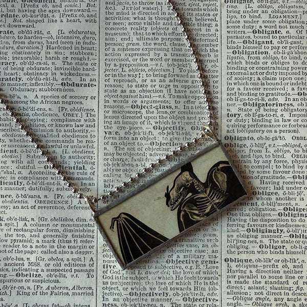 Handcrafted pendant featuring a vampire bat illustrations on either side. The images were upcycled from a book of vintage spooky ephemera.