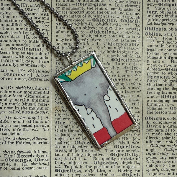 Handcrafted pendant featuring snippets from a vintage 1960s tattered copy of a Babar book with images from the children's classic on either side.